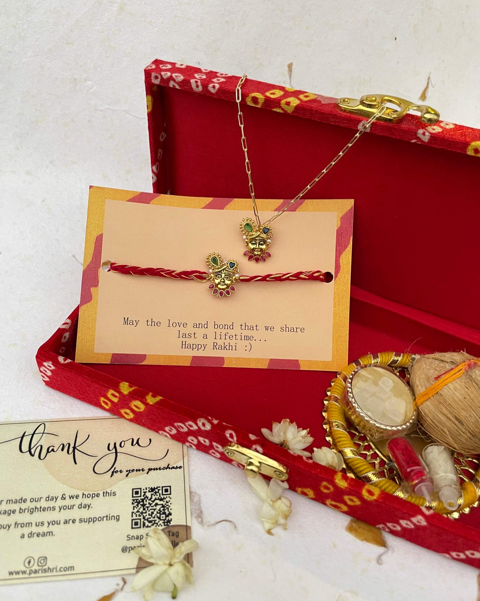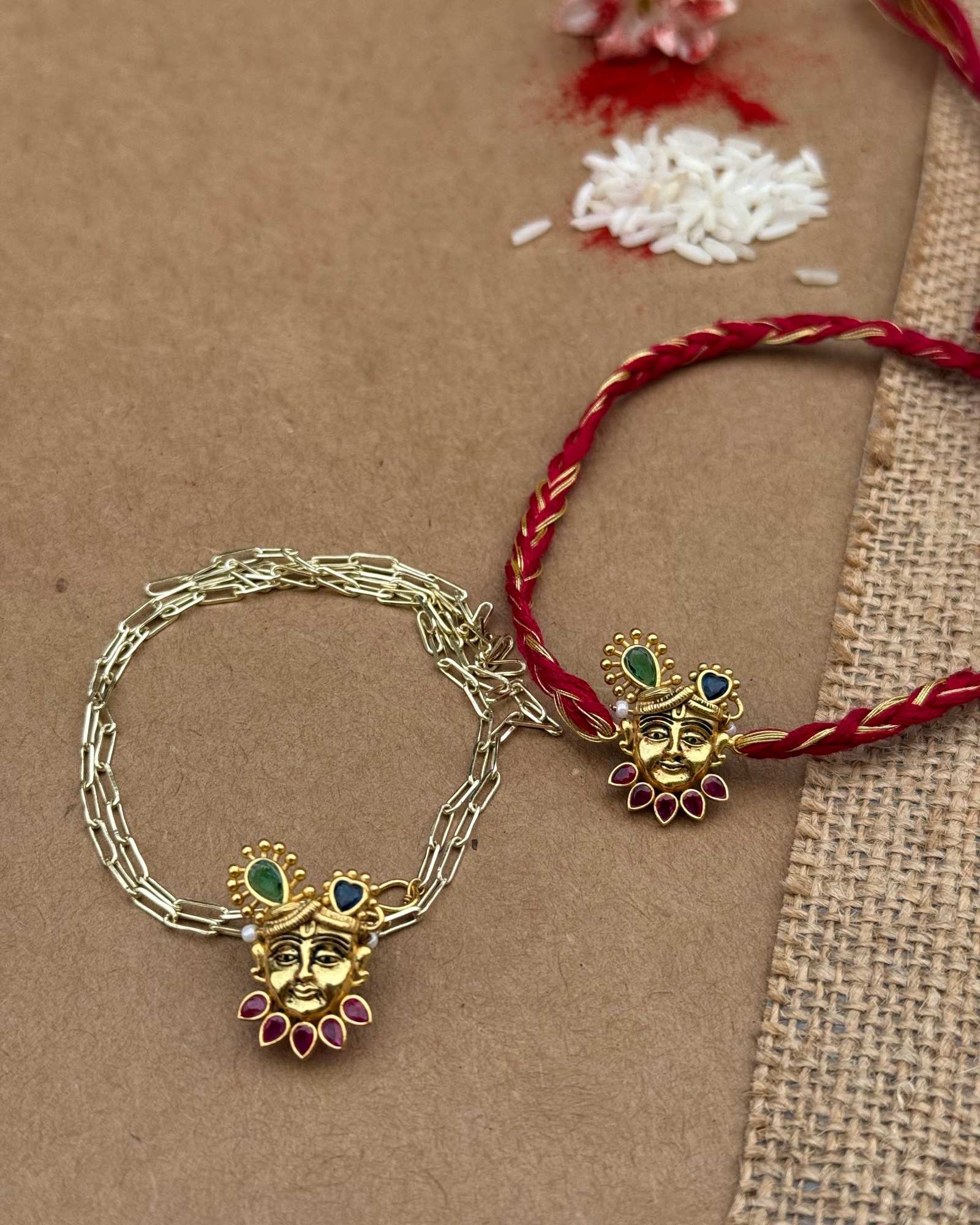 Celebrate divine bonds with this exquisitely paired Shreenath Swaroop Rakhi and Jewellery Lumba Set.The Rakhi features the serene face of Lord Shreenathji, adorned with vibrant stones and tied with traditional threads—symbolising love, protection, and devotion.