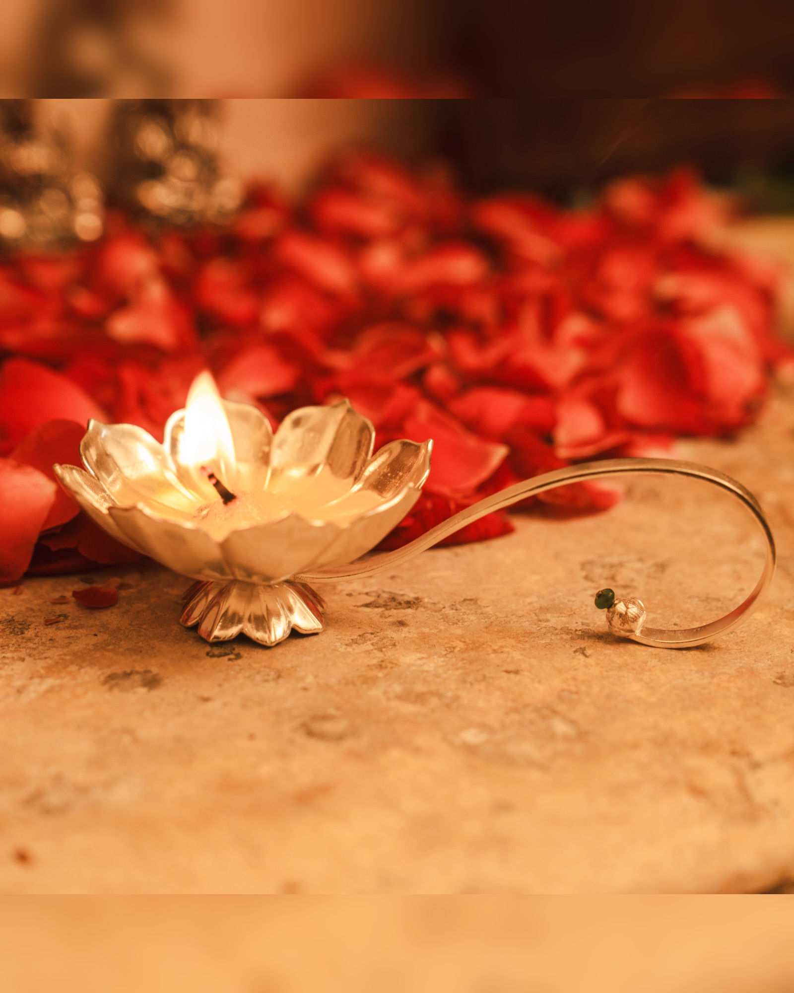 Beautifully handcrafted in silver, this diya is designed in the shape of a blooming flower. A symbol of purity and light, it is perfect for daily pooja, festive rituals, and devotional offerings. Its graceful form adds a serene touch to every prayer and sacred ceremony.